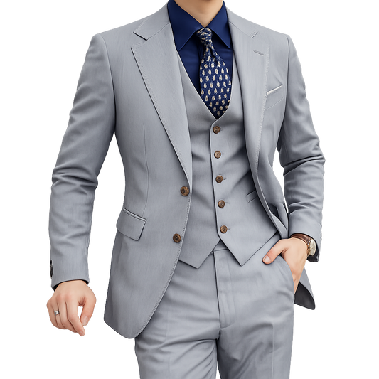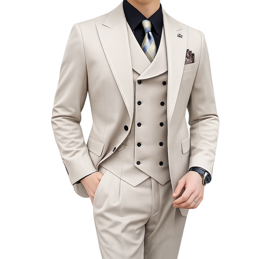 A refined three-piece suit designed for modern elegance.Featuring a tailored blazer, matching vest and slim-fit...
